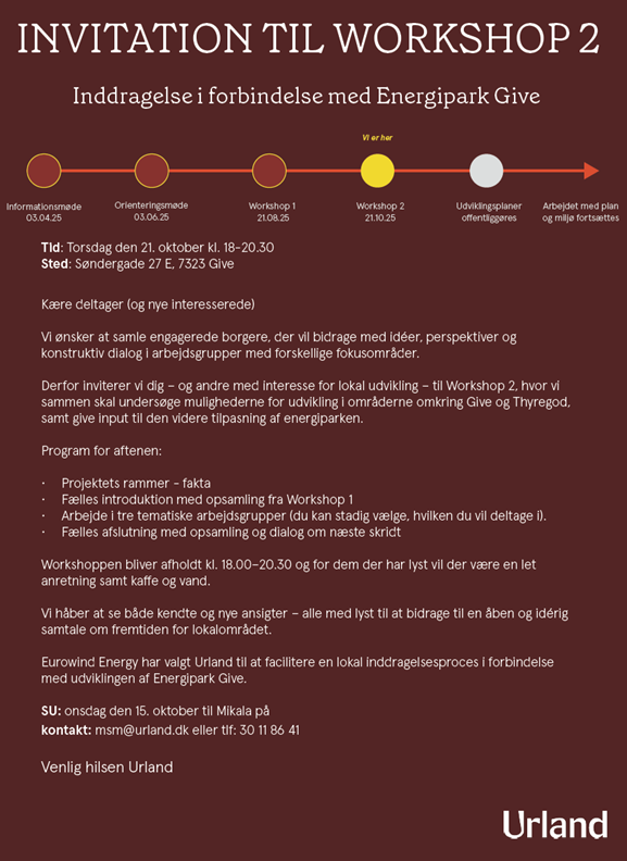 I forbindelse med Energipark Give inviterer Urland til Workshop 2 i processen omkring lokal indragelse.