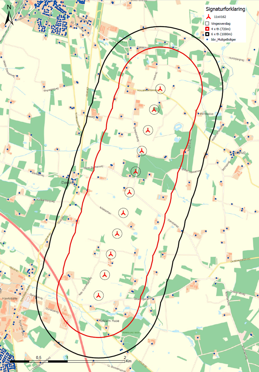 Boliger, der ligger mellem den røde og sorte cirkel på kortet nedenfor, kan gratis søge værditab og salgsoption for projektet Energipark Give.