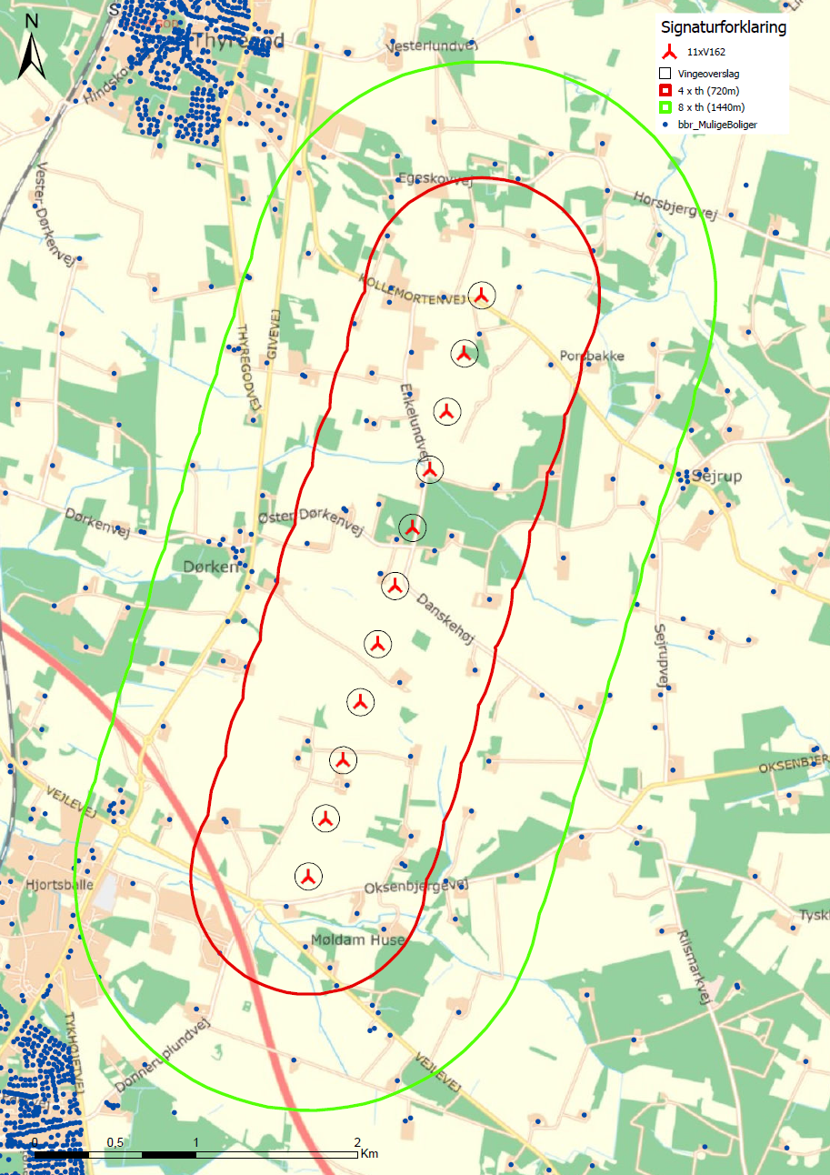 Boliger, der ligger indenfor den grønne og røde cirkel på nedenstående kort, kan søge om VE-bonus for Energipark Give.